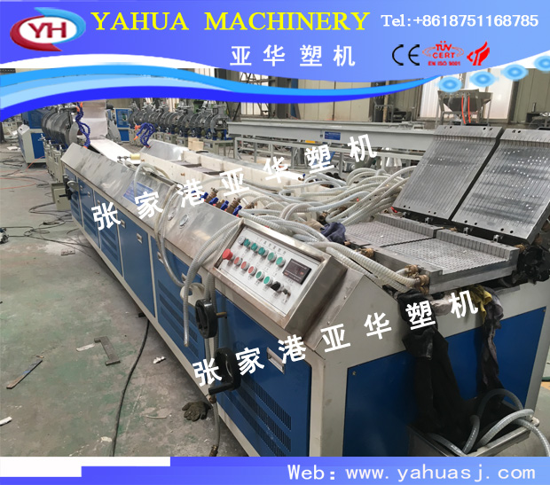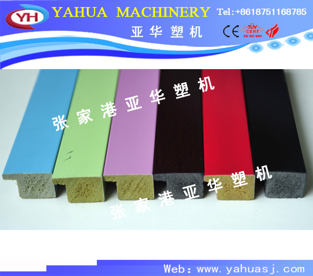 PS foam profile production line is mainly composed of PS foam profile special single screw extruder and complete extruder co-extrusion, cooling water tank, heat transfer units, tractor, cutting machine, double rack. The machine speed control system is equipped with the inverter control, components, such as import temperature control instrument has good plasticizing, high yield, stable operation, etc. Is the new plastic machinery industry development of a new type of production equipment. Including heat transfer unit is based on import prototype design improvements, it is mainly with the method of thermal printing, the color on the ribbon imprinted on the picture frame material. The machine appearance, reliable performance, and precision stamping, strong adsorption capacity. And the adjusting handwheel can stamping all kinds of different shapes of different profile.