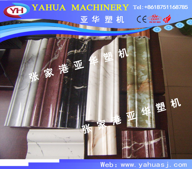 PVC artificial marble, imitation marble) profile production line equipment is mainly composed of the following: 51, 65, conical double screw plastic extruder, die, cooling vacuum calibrating bench (), tractor, cutting machine, flip, high speed mixer, plastic crusher, extrusion forming on the surface treatment (heat transfer or water transfer printing), etc.