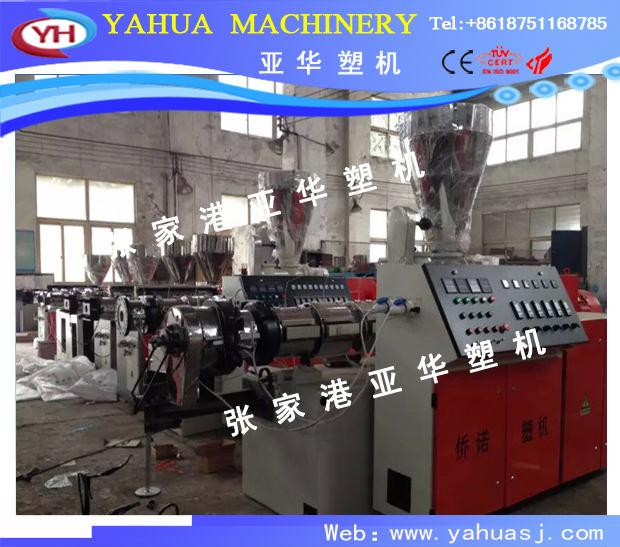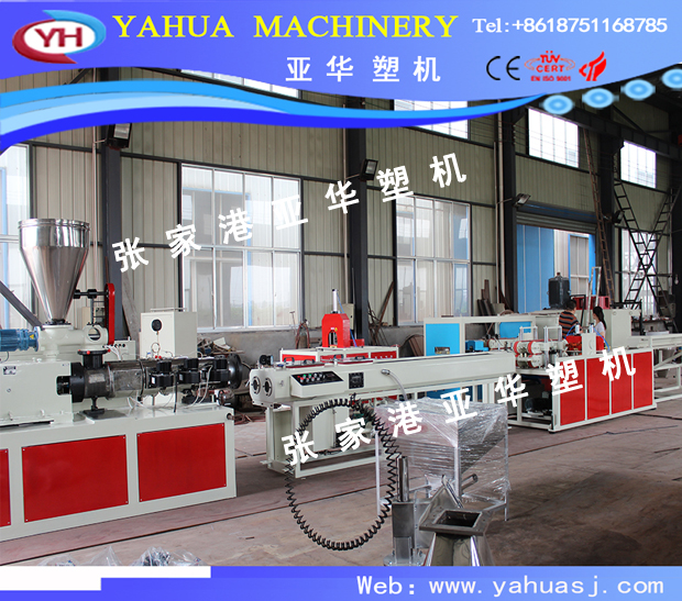 Production line by the conical twin screw extruder, vacuum calibrating bench, tractor, cutting machine, material, etc, of screw extruder and hual off.