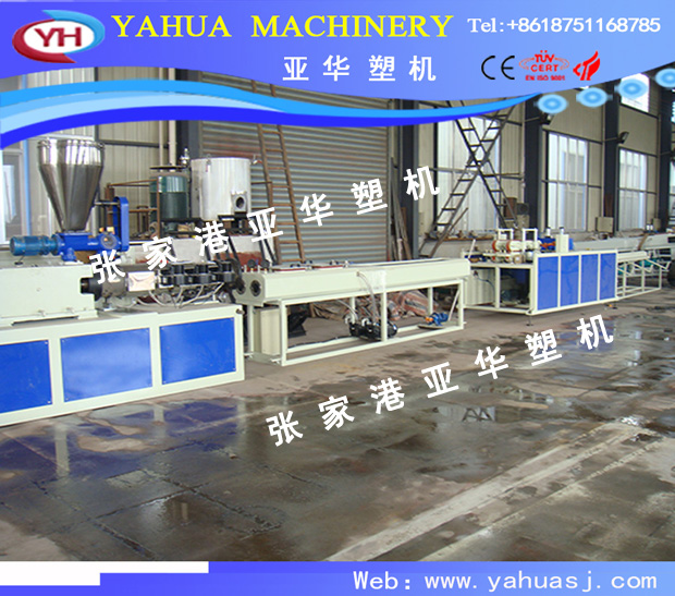 Production line by the conical twin screw extruder, vacuum calibrating bench, tractor, cutting machine, material, etc, of screw extruder and hual off.