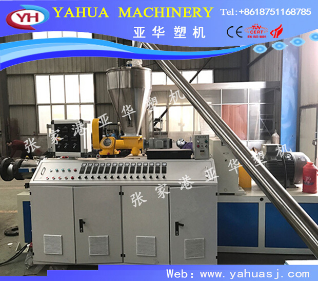 混料機(jī)→→錐形雙螺桿擠機(jī)出→→單螺桿擠出機(jī)→→型材模具→→真空定型平臺→→牽引機(jī)→→切割機(jī)→→卸料臺