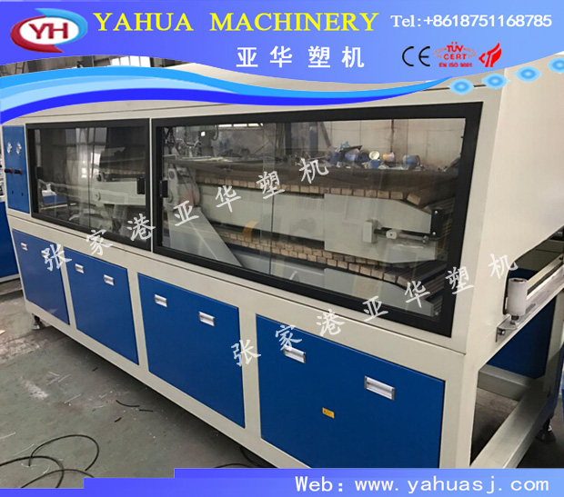 混料機→→錐形雙螺桿擠機出→→單螺桿擠出機→→型材模具→→真空定型平臺→→牽引機→→切割機→→卸料臺