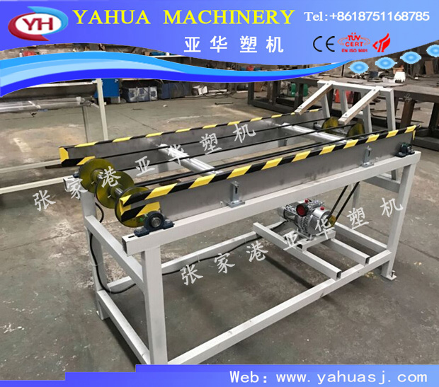 混料機(jī)→→錐形雙螺桿擠機(jī)出→→單螺桿擠出機(jī)→→型材模具→→真空定型平臺(tái)→→牽引機(jī)→→切割機(jī)→→卸料臺(tái)